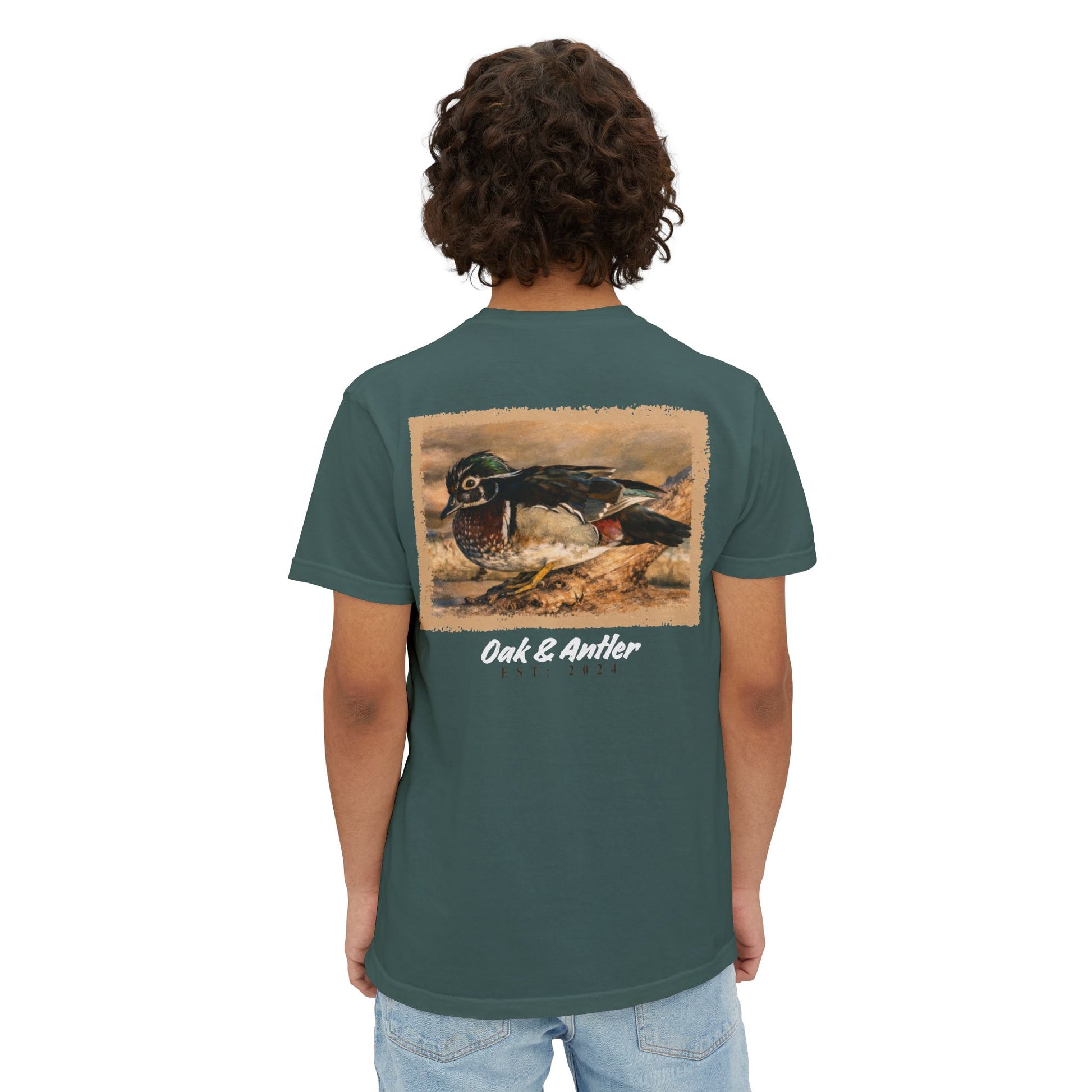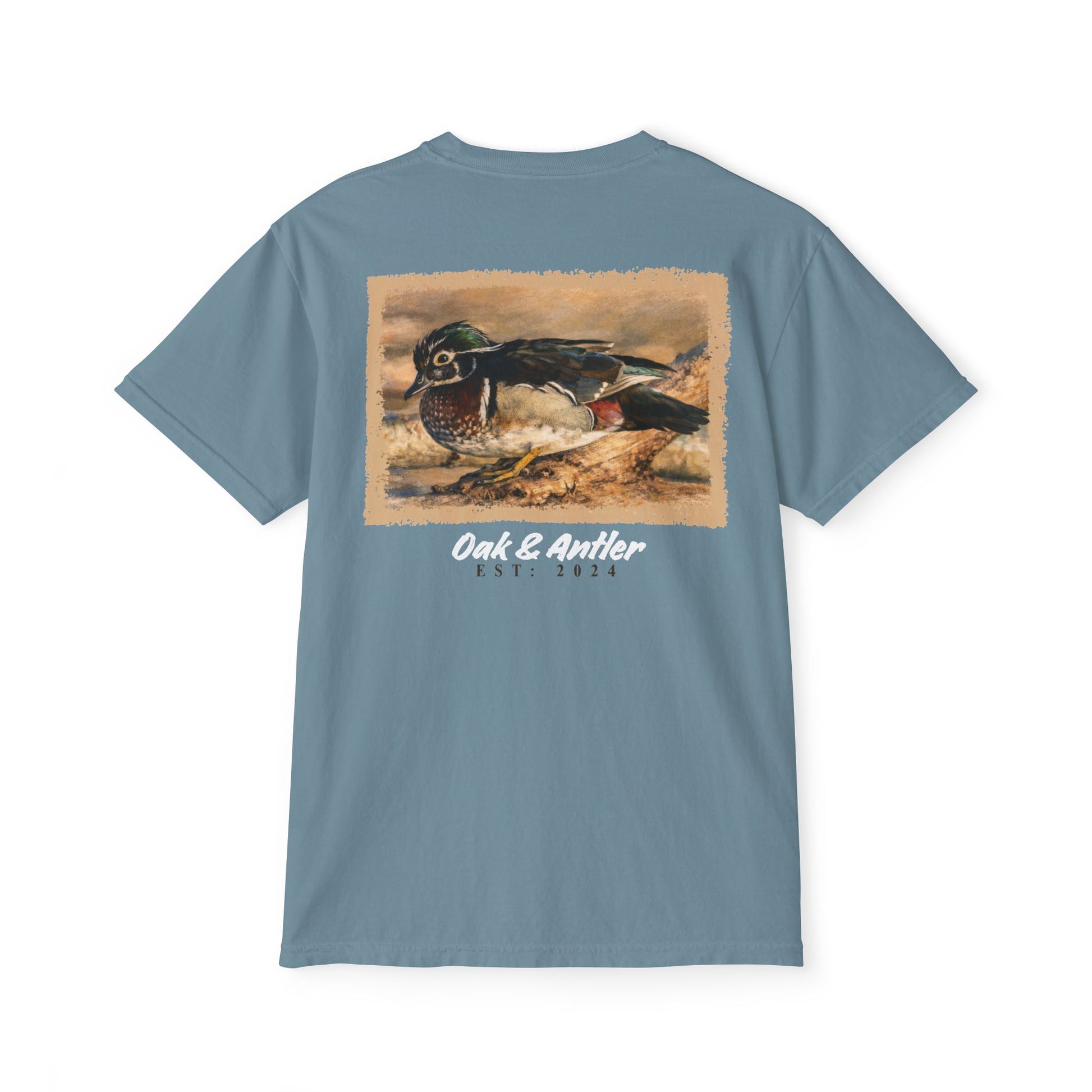 Part of the Oak & Antler Wild Birds Collection, the Stillwater Wood Duck Pocket Tee features a detailed vintage-style illustration inspired by quiet creeks and calm water edges. Framed in warm, rustic tones, this design captures the kind of moment you only notice when everything slows down.